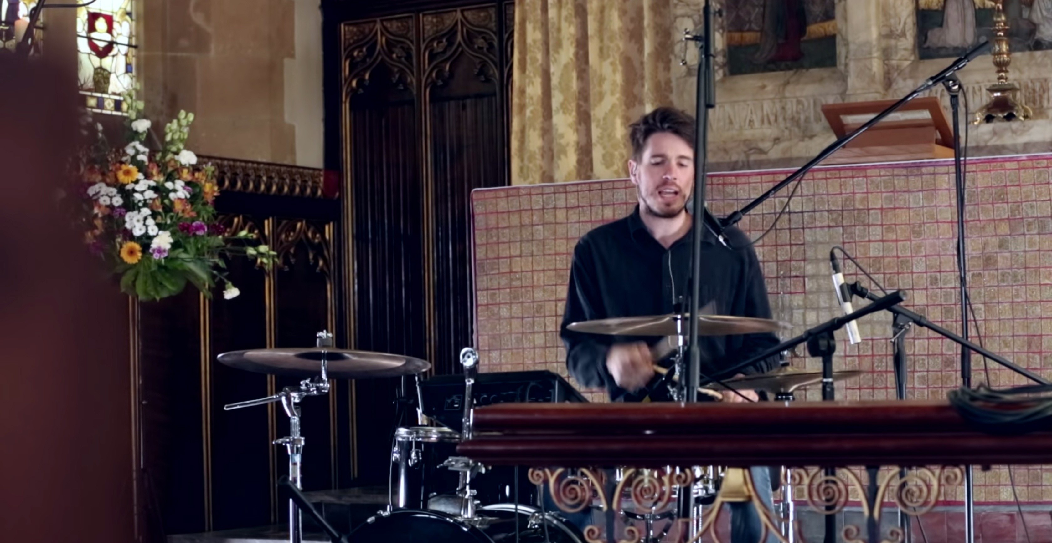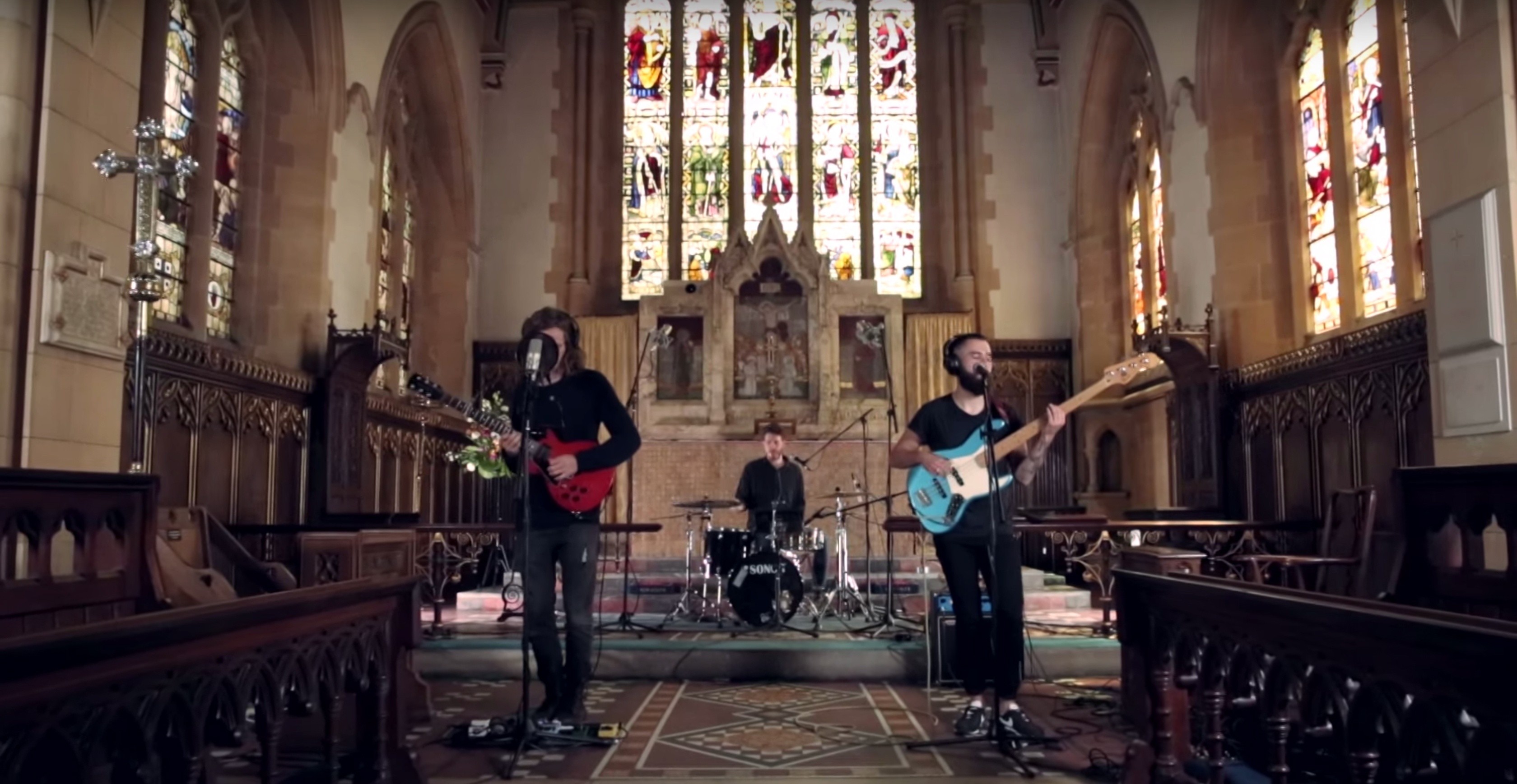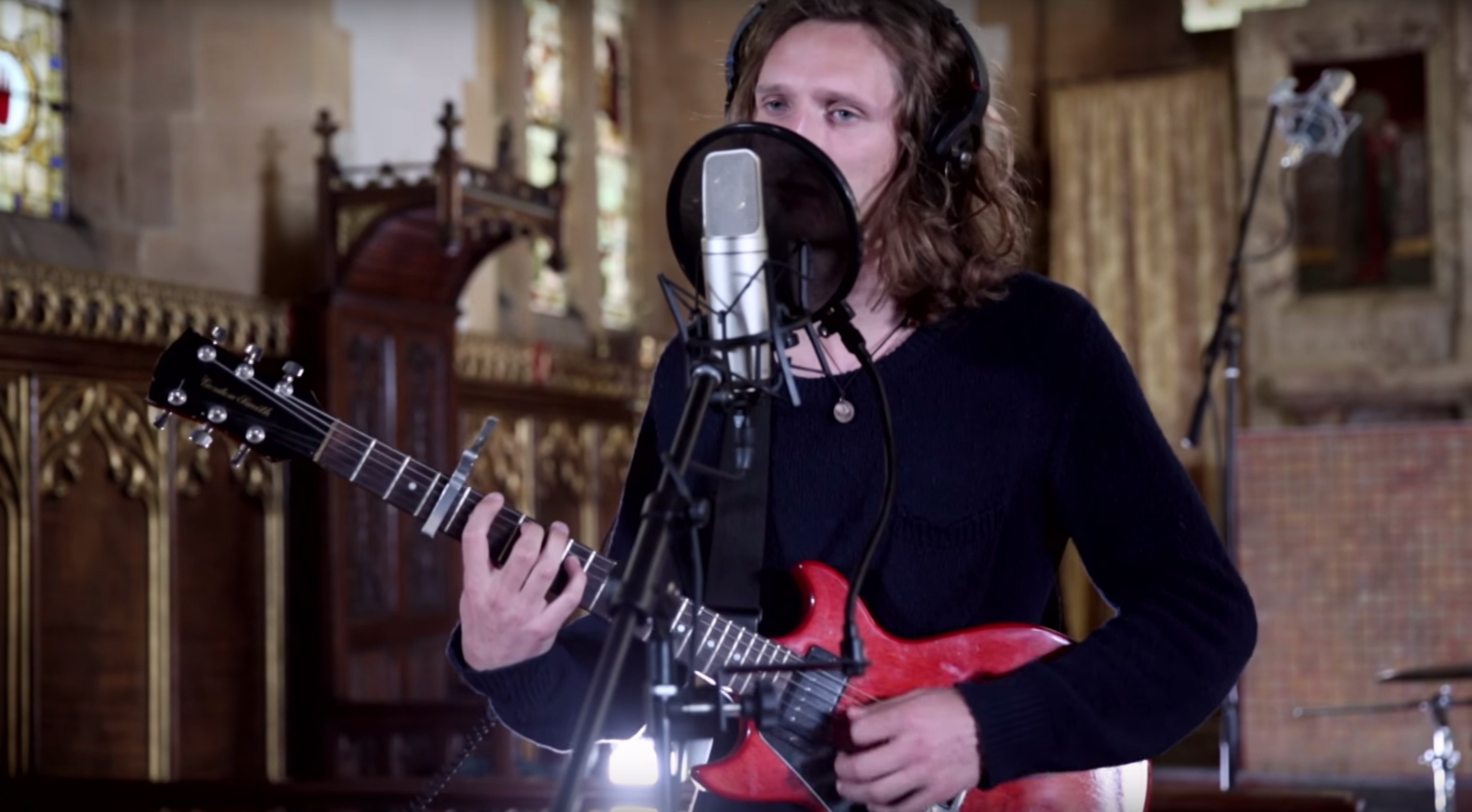 For starters, dynamic mics were chosen for the two backing vocal mics (for drummer Aaron and bassist Chris). Dynamic mics tend to have a low sensitivity, meaning the sound source needs to be close and relatively loud to be picked up. But the aim wasn’t to avoid the sound of the church altogether. The ’big room’ effect sounds magic on drums, so the drum kit was miked using a combination of close, dynamic mics (on kick, snare, and floor tom) and condenser mics for the stereo pair of high overheads, which were carefully spaced with the snare drum at the centre point to avoid phase issues. For Joe’s main vocal, a condenser mic was chosen here too. Condensers generally have a clearer top-end response, and capture an overall more crisp and clear sound, so the compromise between spill and vocal clarity was carefully balanced by the recording team. Condensers, however, are prone to wind pops called plosives, caused when the singer makes ‘B’ and ‘P’ sounds while singing.