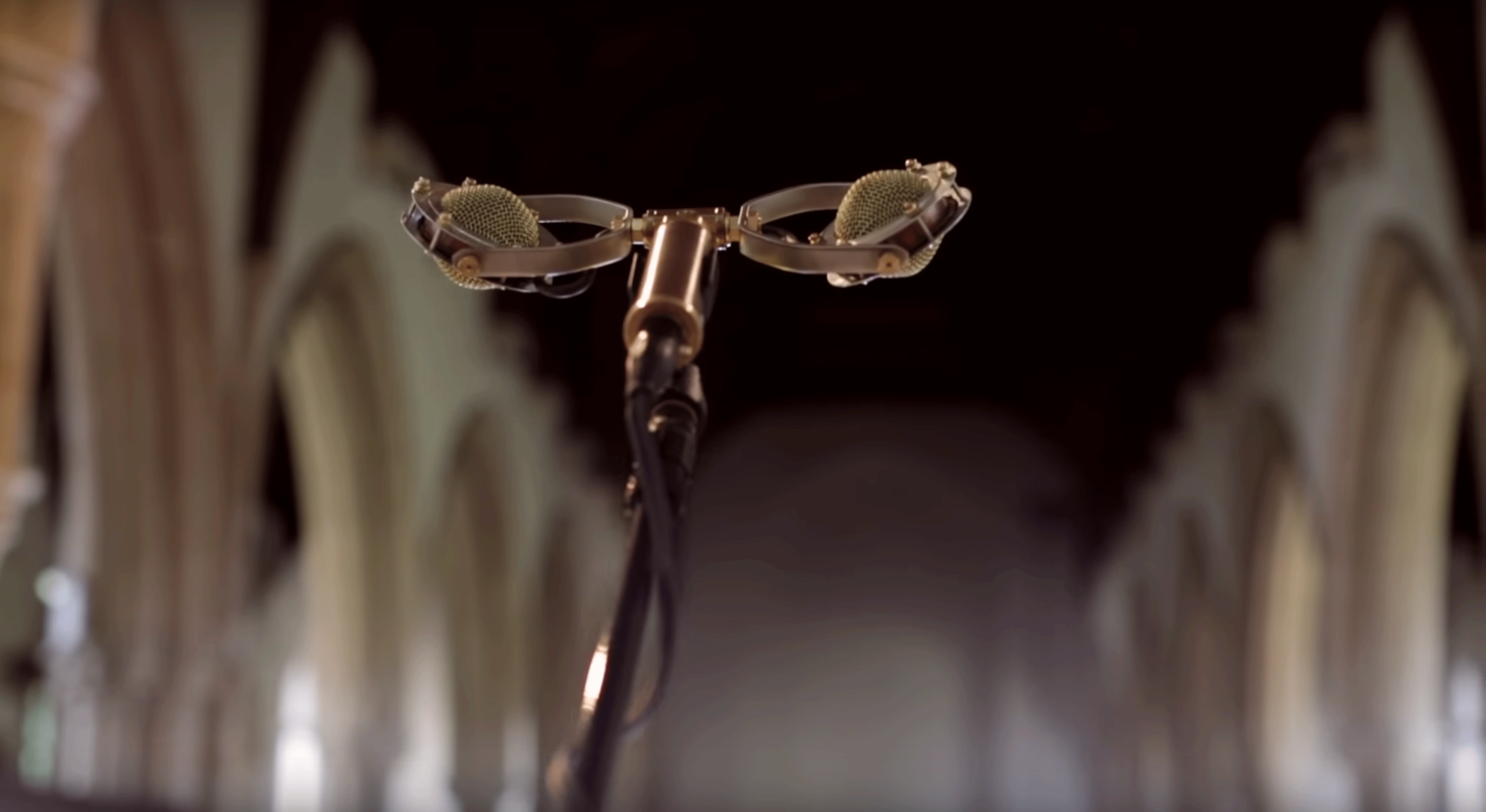 Next was to listen to the room as the choir warmed up, to identify the sweet spots in the venue. Though there are some established mic techniques that will provide surefire results (such as X-Y pairs, spaced stereo pairs, Decca Trees and ORTF arrays), each venue will have interesting-sounding pockets where the combination of sonic reflections produce a pleasurable result. After using their ears to discover these sweet spots, the engineers set up a total of 11 mics around the space (including the bizarre-looking Ear Trumpet Labs Evelyn stereo large diaphragm condenser mic), to provide options in the mix and to help fill the stereo field with an accurate representation of the performance.