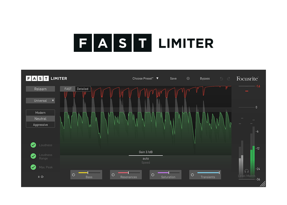 - Choose between three unique Flavours — Modern, Neutral, or Aggressive — to instantly change how FAST Limiter influences your track’s sound.