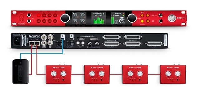 With a Focusrite Red 4Pre or 8Pre in your studio, not only would you have great-sounding conversion and class-leading mic pres, you also have a 32 I/O Dante interface built in. With Dante, you can configure the connected devices any way you like, so all 32 channels need not come from the same physical location (unlike MADI or ADAT, for example). So you could have 16 channels of Dante-enabled mic pres for tracking a string quartet in a room down the hall, four channels for a stereo reverb send/return in the stairway, and a stack of independent headphone stations for the performers. (See point 1, above.)