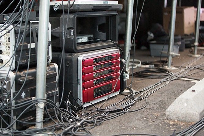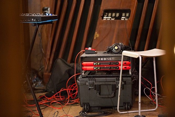Portable racks of Dante devices — such as these two Focusrite RedNet MP8R mic preamps — can be easily located practically anywhere. The Focusrite AM2 (sitting atop the rack) provides a dedicated headphone mix for the performer.
