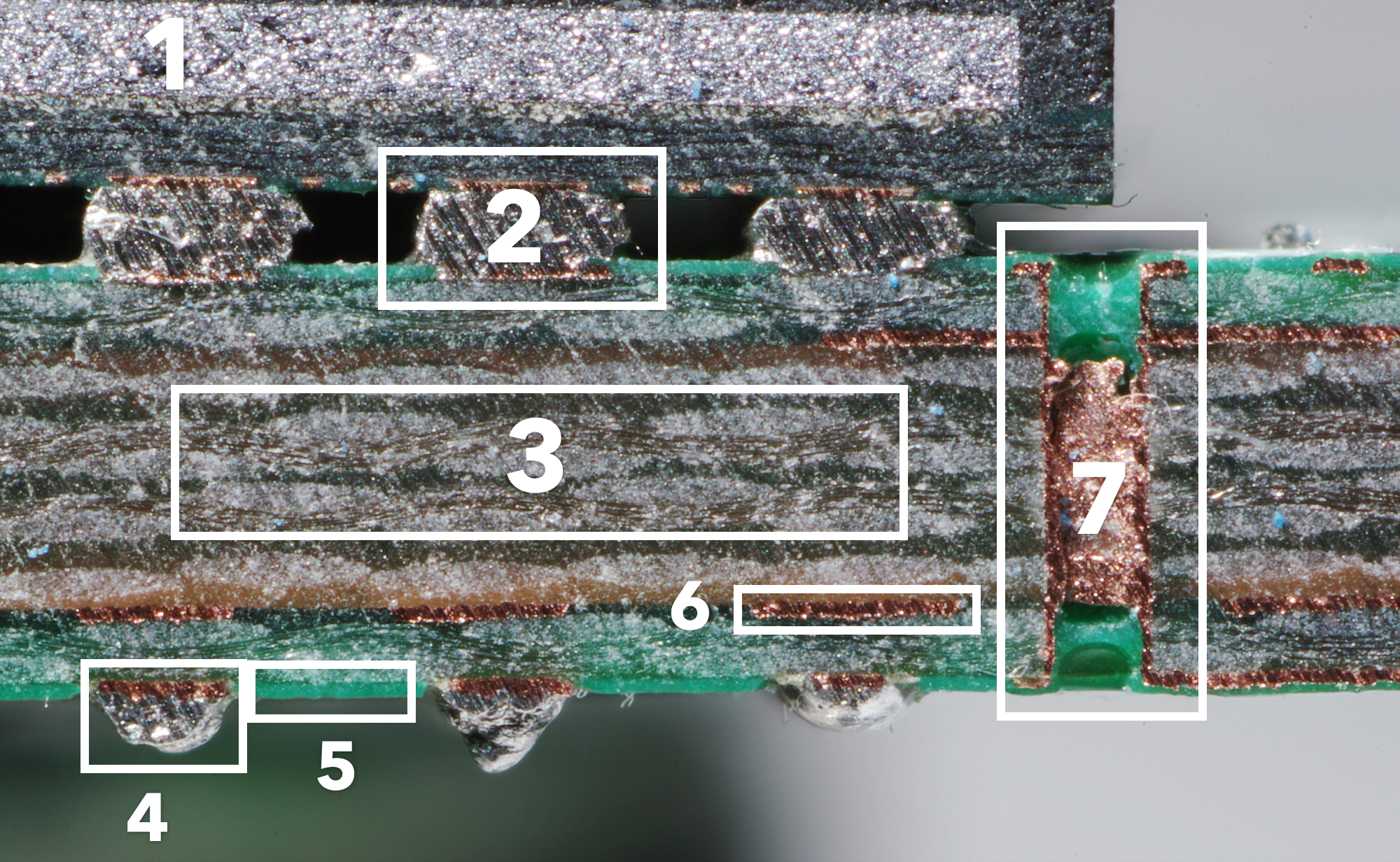 Check out Figure 2 to see an example. This is a microscopic photo of a cross section cut right through an SMD attached to a multi-layered circuit board. The SMD (1) is attached to the top of the board by solder pads (2). The board underneath is made of several layers of glass fiber (3). As you can see, there are the usual external solder joints (4) and the green solder resist that separates them to prevent short circuits (5). Look closer, though, and you'll see other connections inside the board (6), making the overall routing many times more complex without sacrificing quality!
