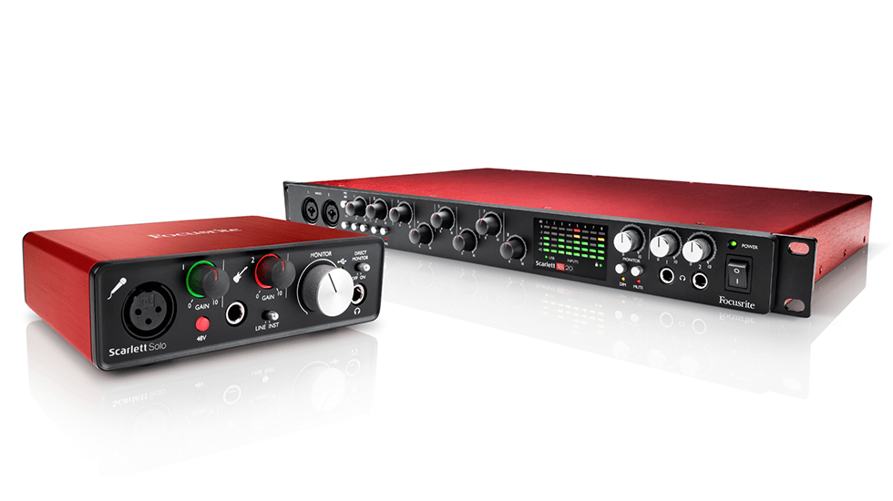 Interfaces with only a few inputs and outputs, like Focusrite’s Scarlett Solo (left), usually come in a ‘desktop’ format, but more comprehensive devices like the Scarlett 18i20 are designed to fit into a standard studio 19-inch rack.