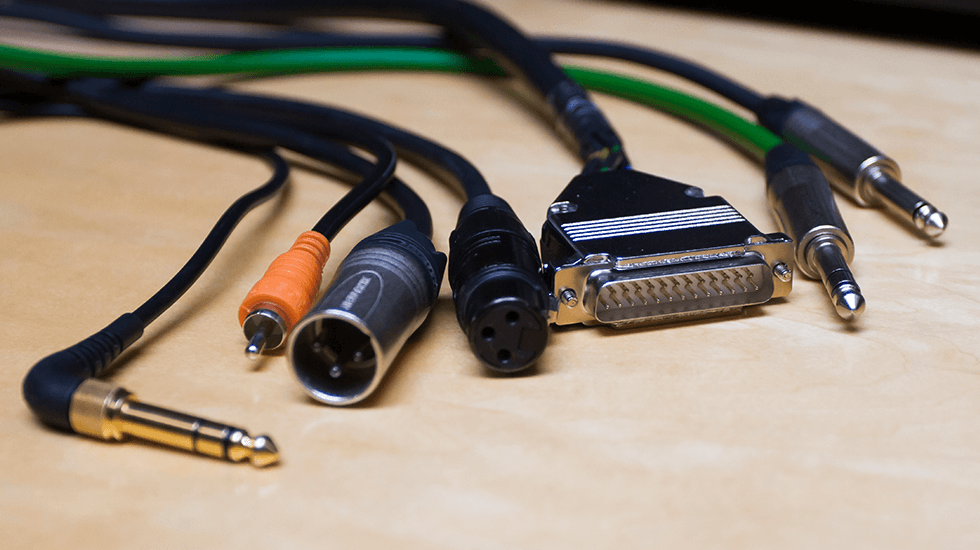 Audio connector types (left to right): A stereo quarter-inch cable — as found on the end of a headphone cord. An RCA plug, used for unbalanced connections. Male XLR. Female XLR. DB25 connector (aka D-Sub).Quarter-inch TRS (Tip Ring Sleeve) connector, for balanced connections. Quarter-inch TS (Tip Sleeve) connector, for unbalanced line-level connections and instrument.