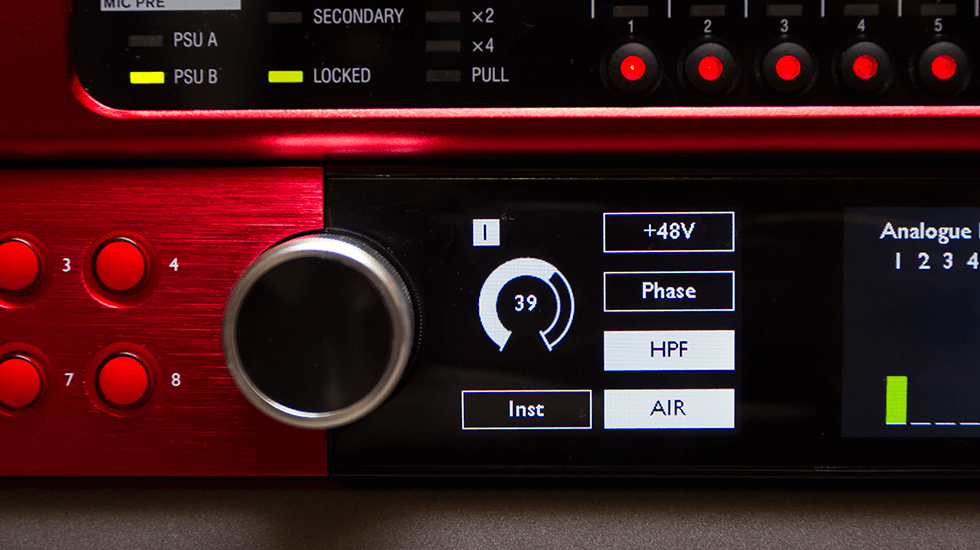 Because the signal levels coming from microphones can vary widely, microphone inputs let the user vary the amount of preamplification that is applied to bring them up to line level. The preamps on Focusrite’s Red 8Pre interface also feature phantom power, high-pass filters, polarity/phase reversal and Focusrite’s unique Air control.