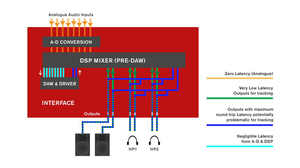 Block diagram showing input signals routed through a digital mixer within the interface to set up a low-latency monitoring path.