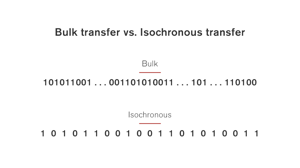 The difference between a bulk transfer and a real-time streaming (isochronous) transfer. Bulk transfers are sporadic, and would wreak havoc on your pristine audio streams.