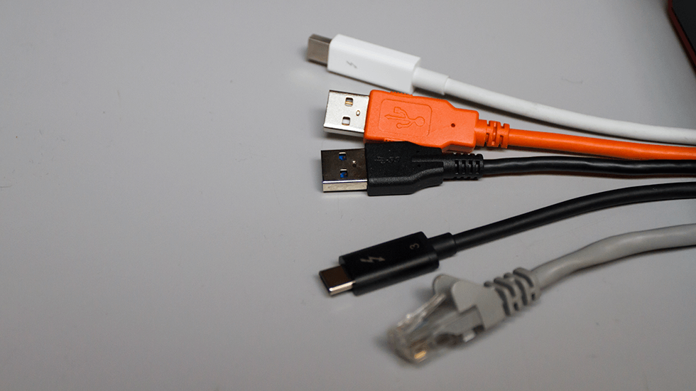 Cable types (top to bottom): Thunderbolt 1 & 2 using the MiniDisplayPort connector. USB 1 & 2 (orange). USB 3 (note the blue plug interior). USB-C / Thunderbolt 3. Ethernet/RJ45 — usually for networked audio applications.